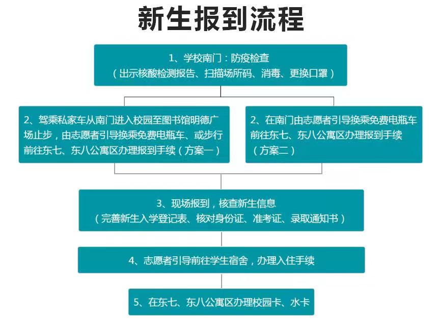 学校南门口进行防疫检查→前往东七、东八公寓区报到→安排宿舍、领钥匙→入住宿舍→办理水卡、校园卡等。