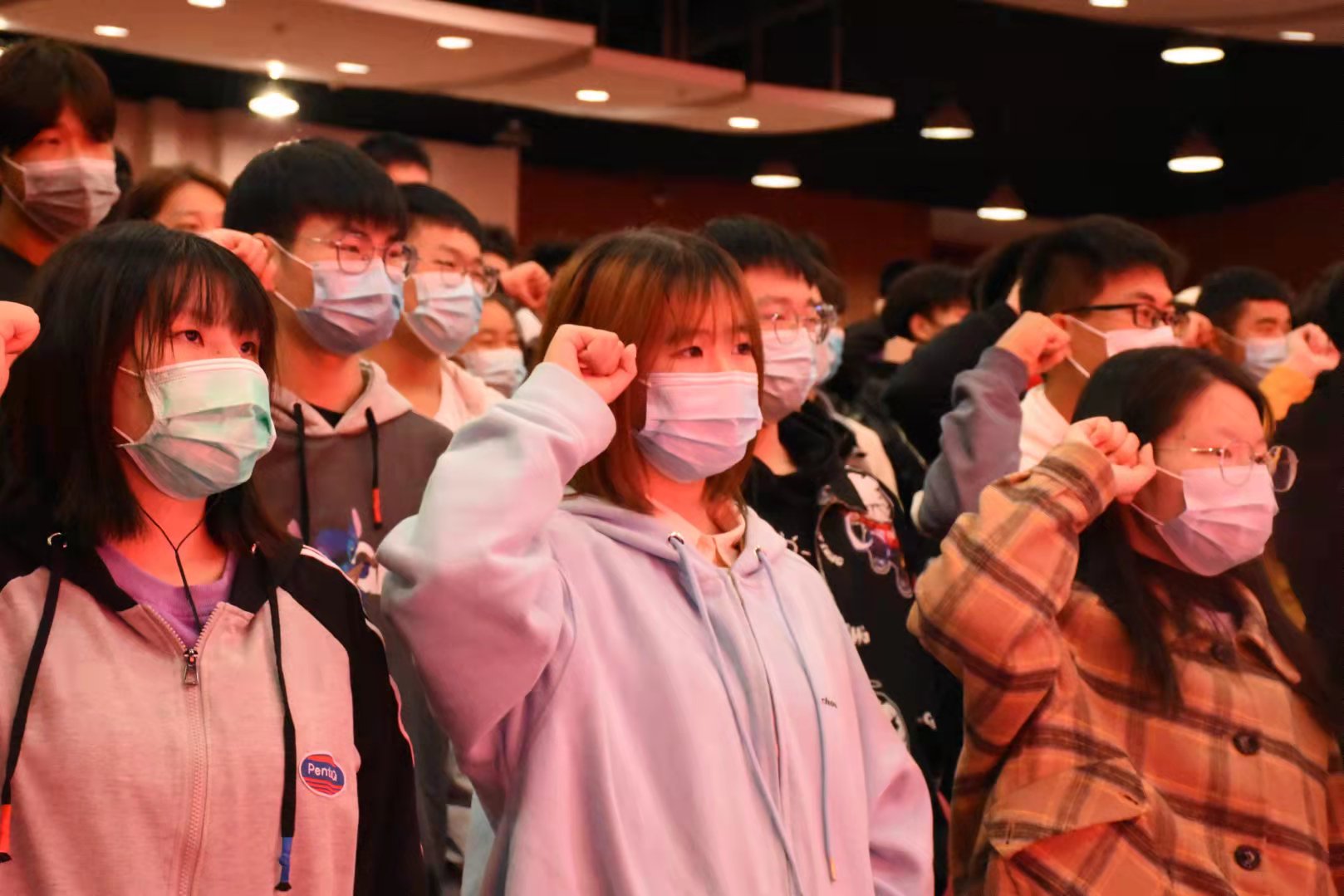 团总支书记李明带领全体新生进行了庄严的入学宣誓,新生们铿锵有力的声音响彻会场,表达了做合格大学生的坚定决心。老生代表乔新满、新生代表李悦分别发言。